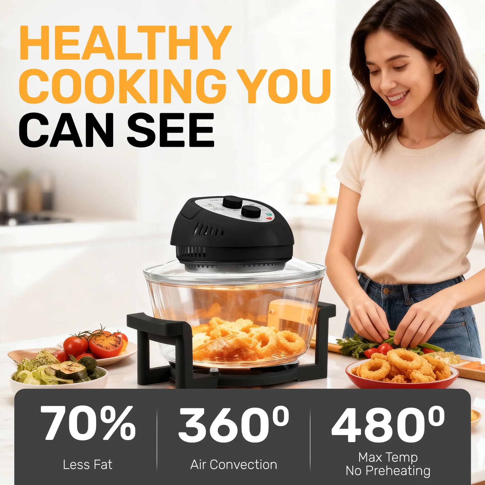 Watch meals perfectly cook with 360° convection. Enjoy 70% less fat and instant 480° heat without preheating!